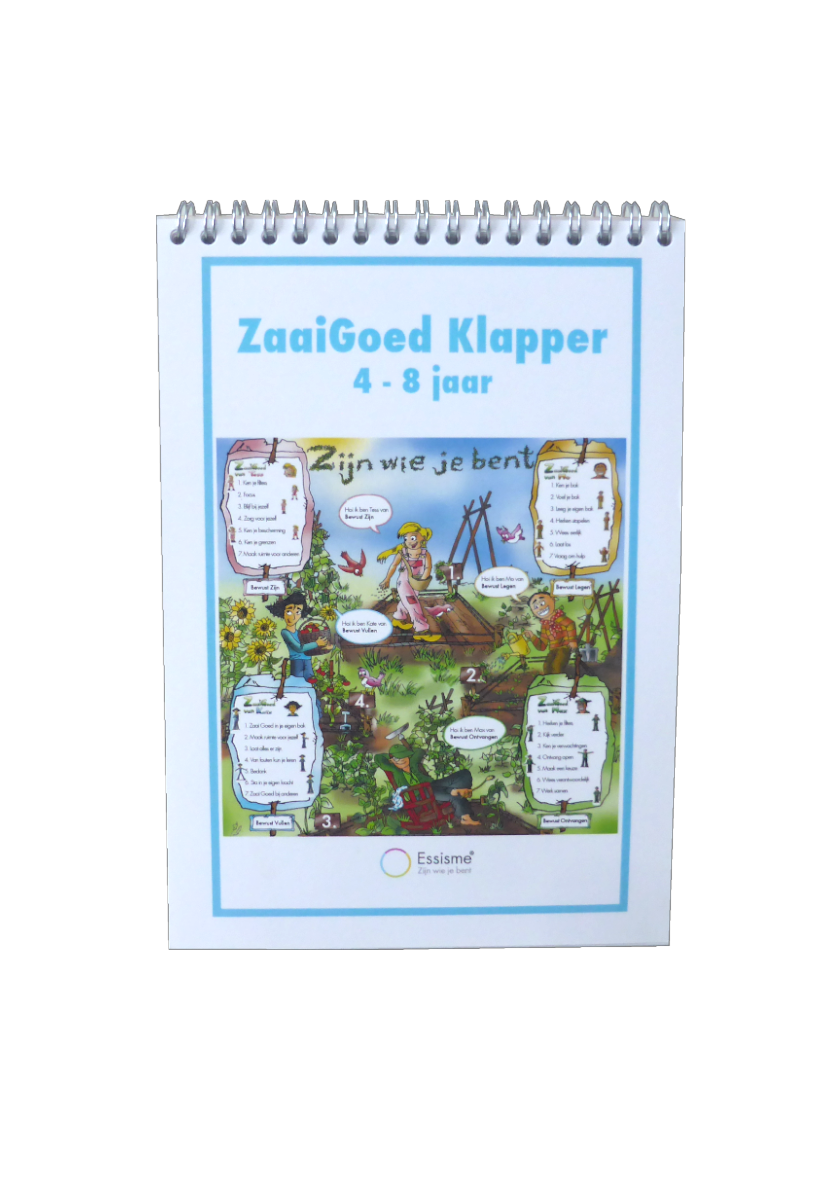 De ZaaiGoedklapper voor de leeftijd van 4 tot 8 jaar bevat alle 28 ZaaiGoed voorzien van afbeeldingen met het gebaar, geïllustreerde verhaaltjes waarin het ZaaiGoed centraal staat afgestemd op deze leeftijdscategorie en 8 emotiekaarten.